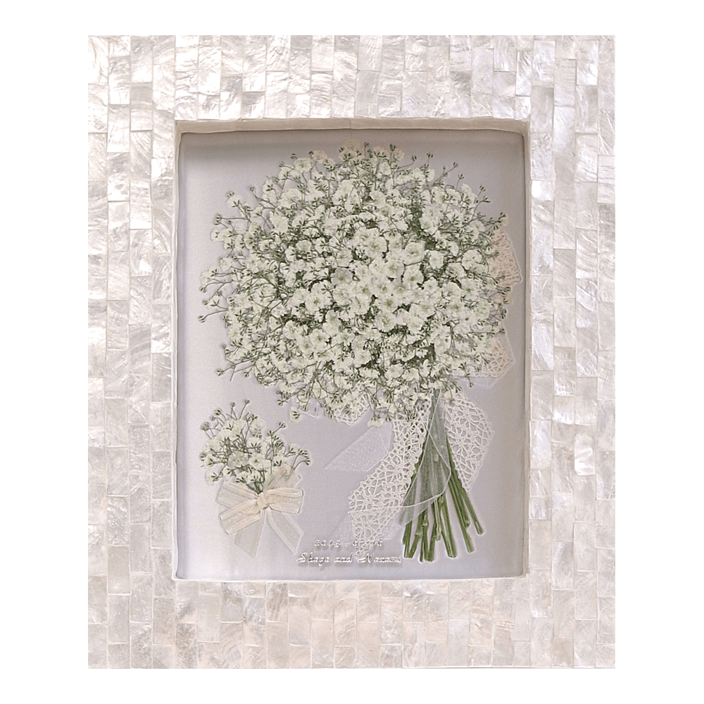 イーブライダルのブーケ・花束保存加工は、完全真空密閉とUVカットガラスによって、いつまでも色褪せることなく美しい姿を保ち続けます。