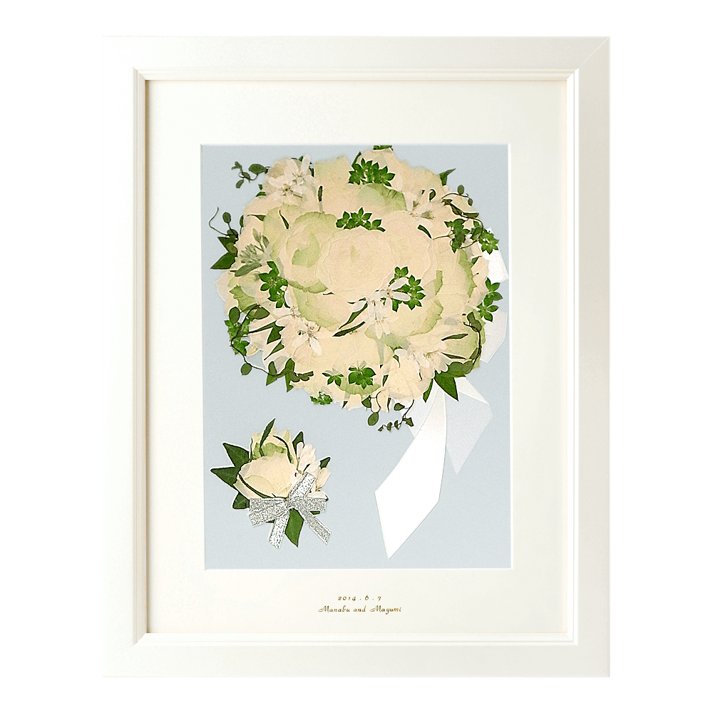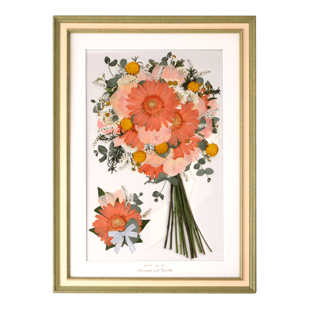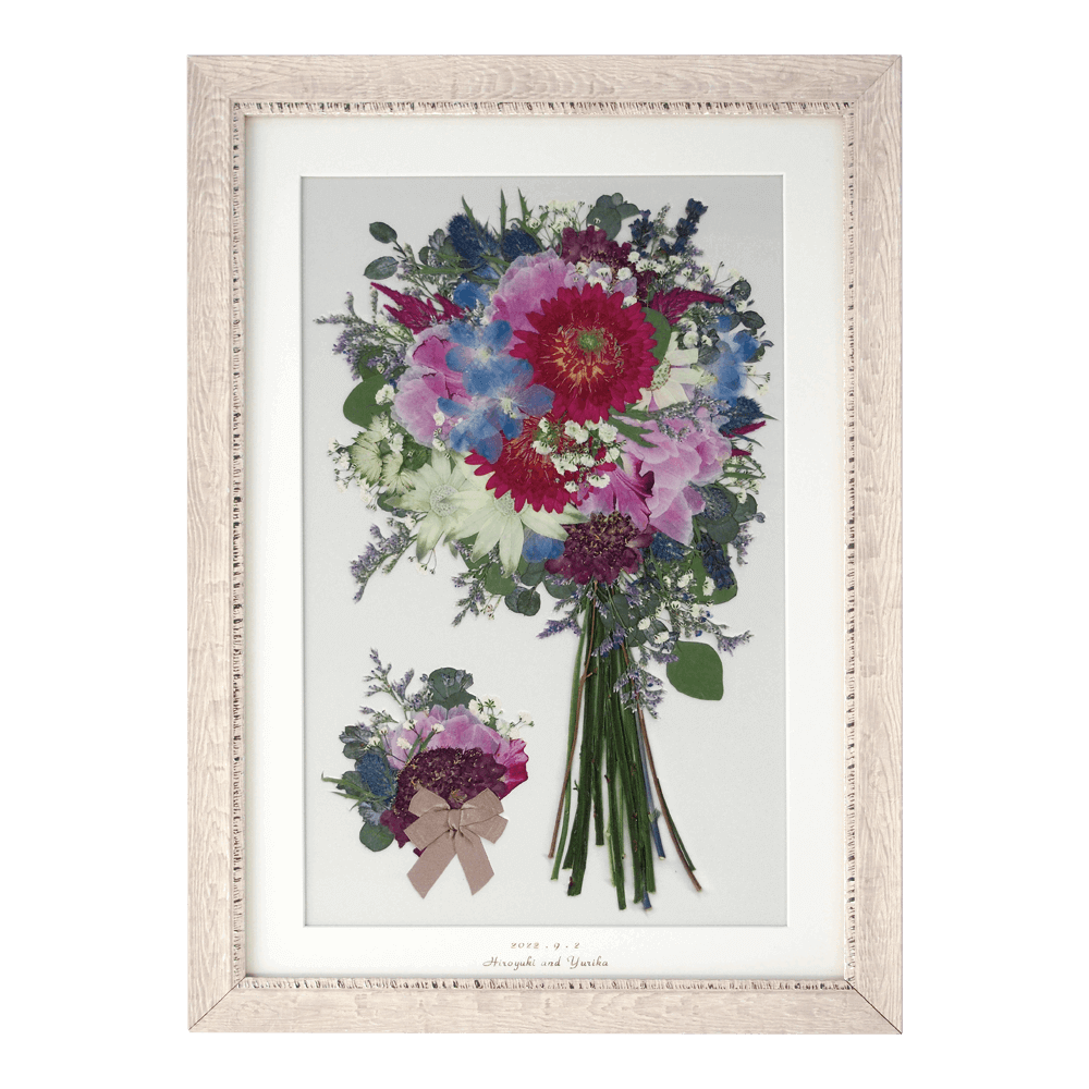 熟練のデザイナーによる高いデザイン力で、ブーケのデザインを残したまま押し花やドライブーケに保存加工いたします。